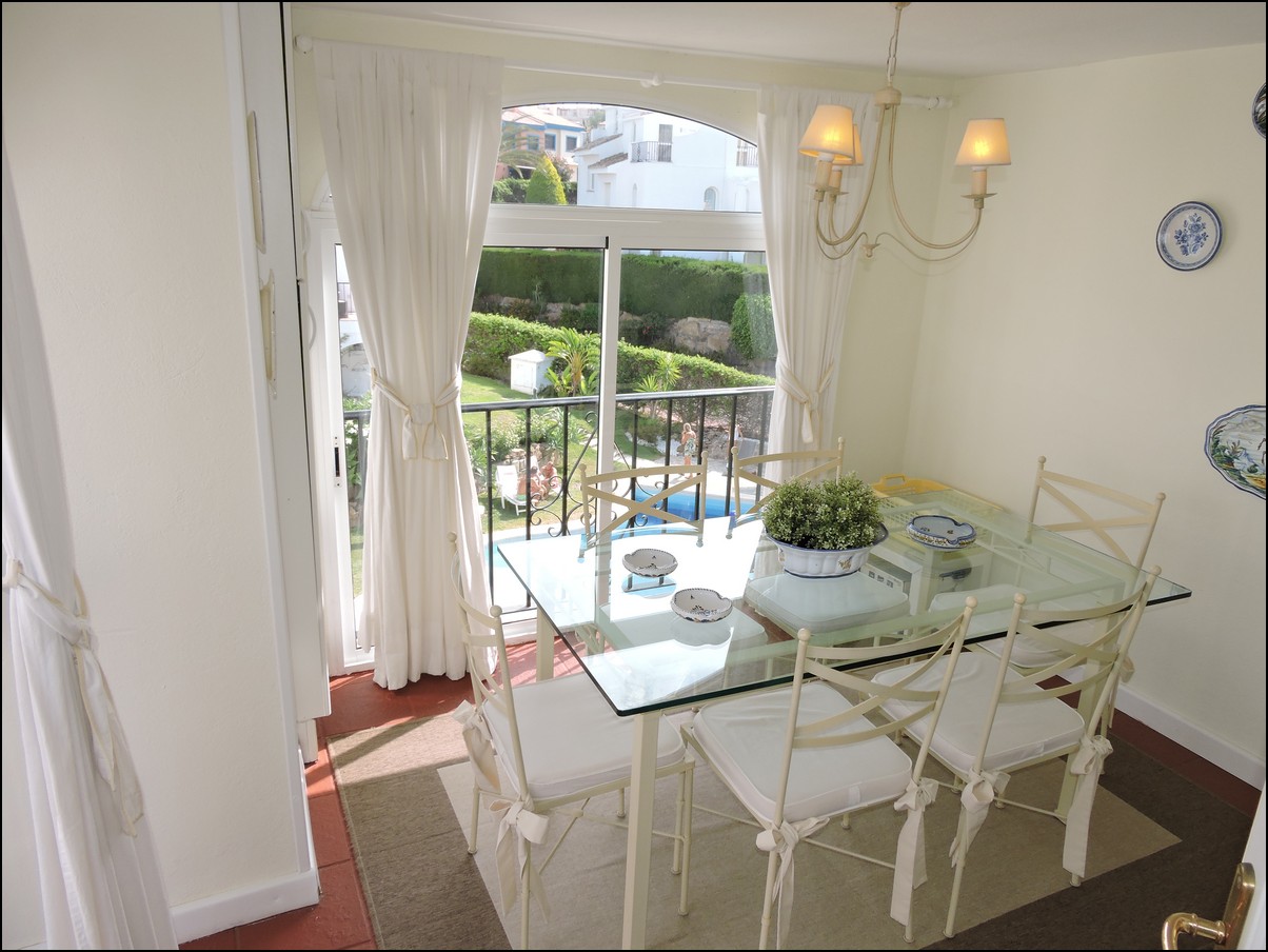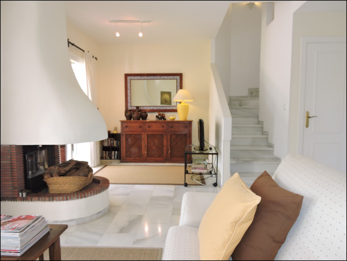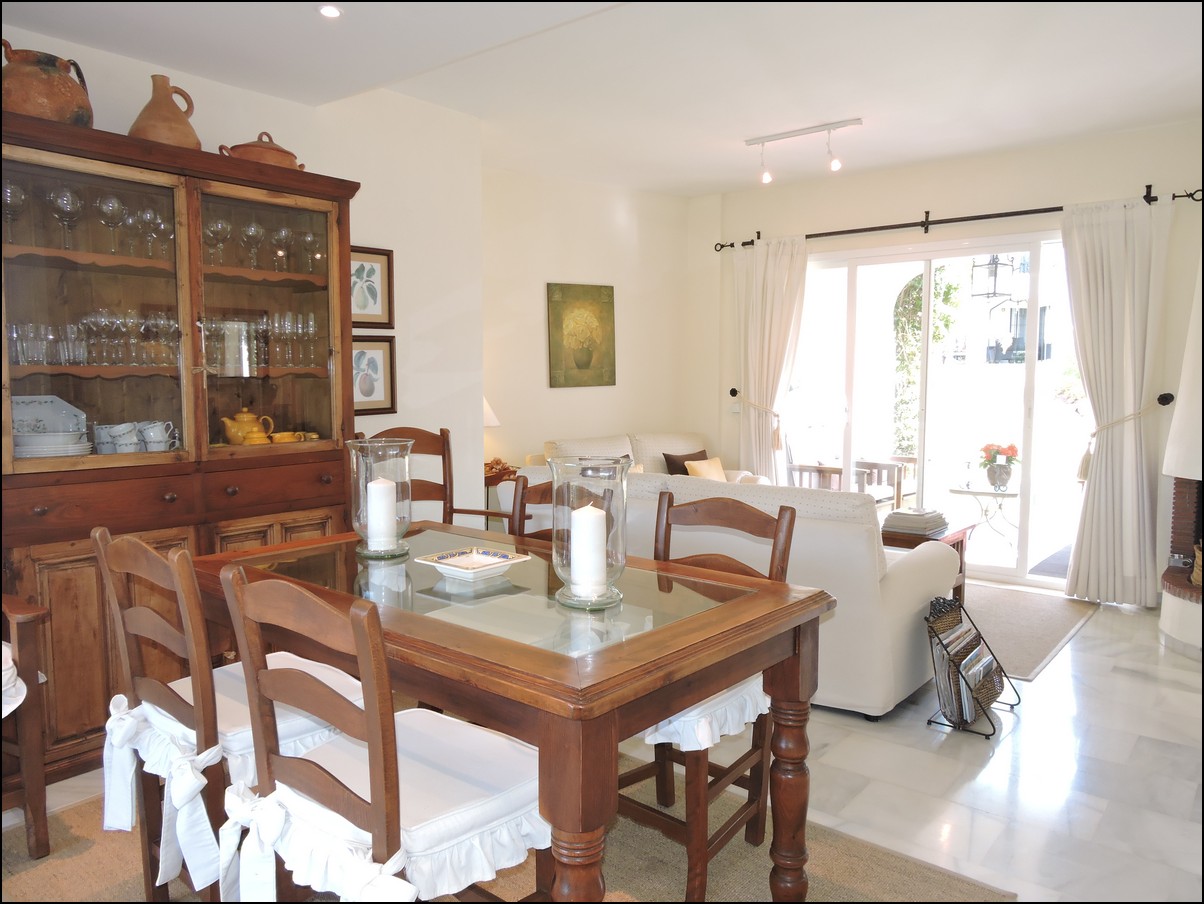 Overview: Townhouse in Duquesa, Altos de la Duquesa. Lovely exclusive small urbanisation with very well kept gardens, pool and the townhouse is in immaculate condition. The house is sold fully furnished and all furnishings are of high standard, beautiful classic décor. Entering the urbanization you have your own private / street parking in front of the door of your house. Little front terrace. Inside, nice good fully fitted corner kitchen. Guest toilet. Good size dining and living room, with fireplace. From the lounge walk out onto a nice terrace looking out onto the gardens and communal pool. First floor two large en-suite bedrooms. Master bedrooms also has a nice terrace looking out onto the pool (South east). Upstairs another bedroom/ dining area at the moment. Barbecue, loungers and great area to bake in the sun. All in absolute fantastic condition. Great little holiday home or first residence. Townhouse in Duquesa, Altos de la Duquesa. Adosado en Duquesa, Altos de la Duquesa. Preciosa y exclusiva urbanización pequeña con jardines muy bien cuidados, piscina y la casa adosada en perfectas condiciones. La casa se vende completamente amueblada y todos los muebles son de alta calidad, hermosa decoración clásica. Al ingresar a la urbanización tiene su propio estacionamiento privado / en la calle frente a la puerta de su casa. Pequeña terraza delantera. En el interior, buena cocina de esquina totalmente equipada. Aseo de invitados Buen tamaño comedor y sala de estar, con chimenea. Desde el lounge salir a una agradable terraza con vistas a los jardines y la piscina comunitaria. Primera planta dos habitaciones grandes con baños en-suite. El dormitorio principal también tiene una bonita terraza con vistas a la piscina (sureste). Arriba, otro dormitorio / área de dining en este momento. Barbacoa, tumbonas y una excelente zona para hornear al sol. Todo en condiciones fantásticas absolutas. Gran pequeña casa de vacaciones o primera residencia. Sunflower Estates.
