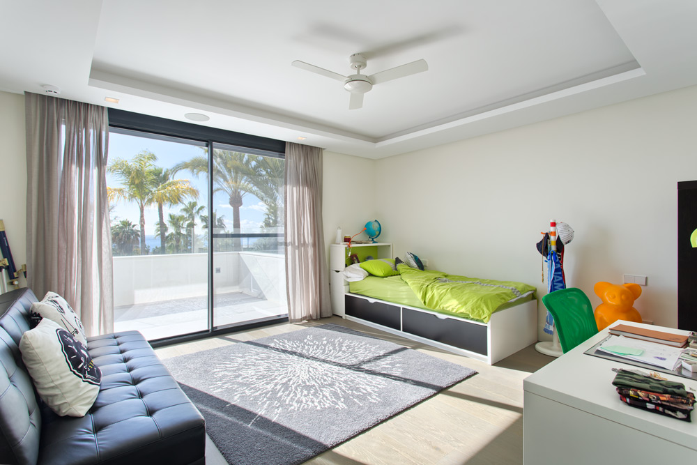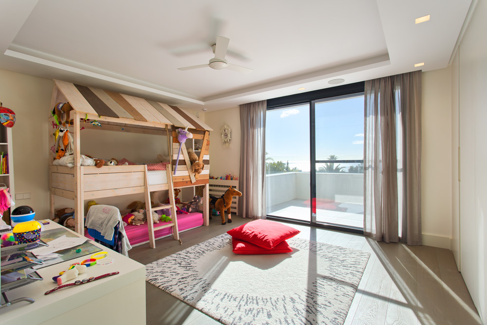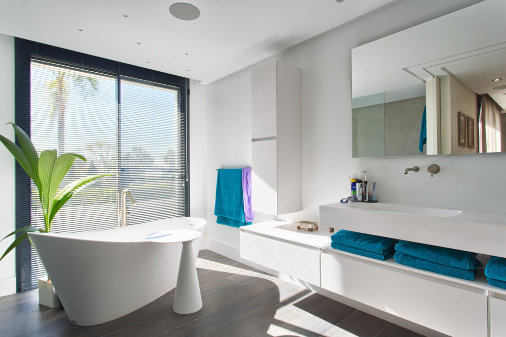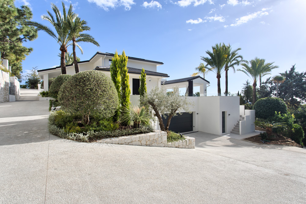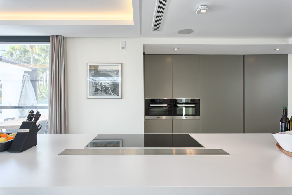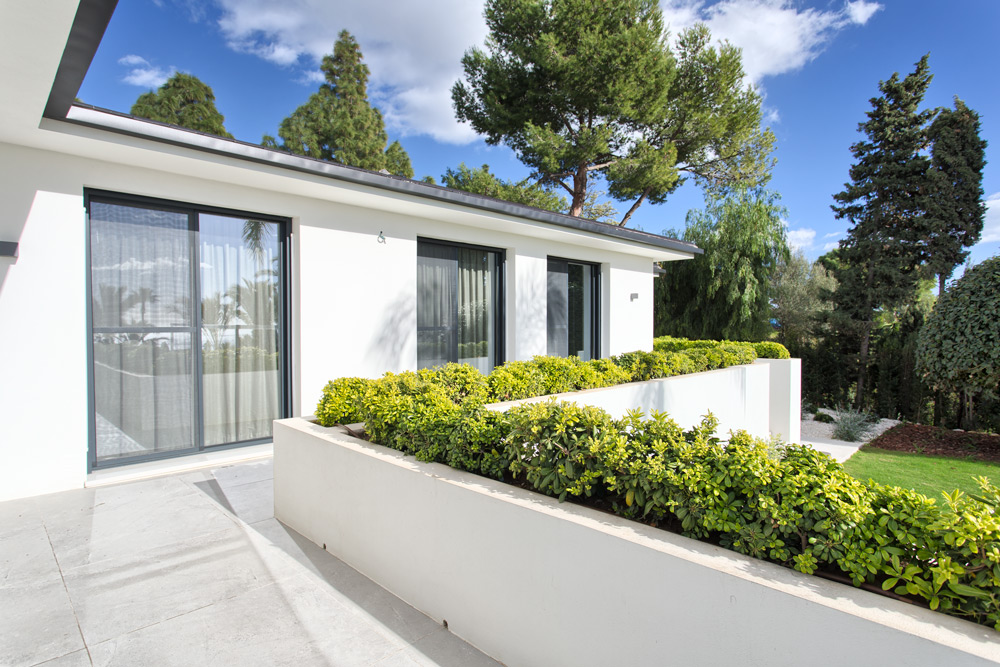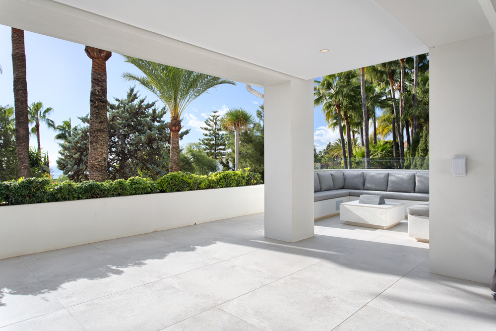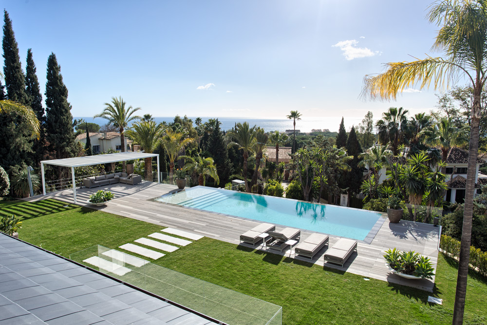 Overview: Recently renovated top quality villa in the residential area of Hacienda Las Chapas. South to southwest facing, quiet and private. Stunning sea views. Main floor: Entrance hallway, spacious living and dining area with high ceilings and fully fitted open plan kitchen (Danespan with Miele appliances). Direct access to the terraces, garden and pool. Master bedroom suite, one guest bedroom and bathroom. First floor: Two guest bedrooms en-suite with own terraces. Lower floor: One bedroom with bathroom and a small kitchen, one car garage and storage. Extra area for a gym or games room. A big plot, mature gardens, infinity pool heated, A/C with heating and individual controlled, underfloor heating, integrated domotic system, sound system Sonos, outdoor kitchen and lounge area..